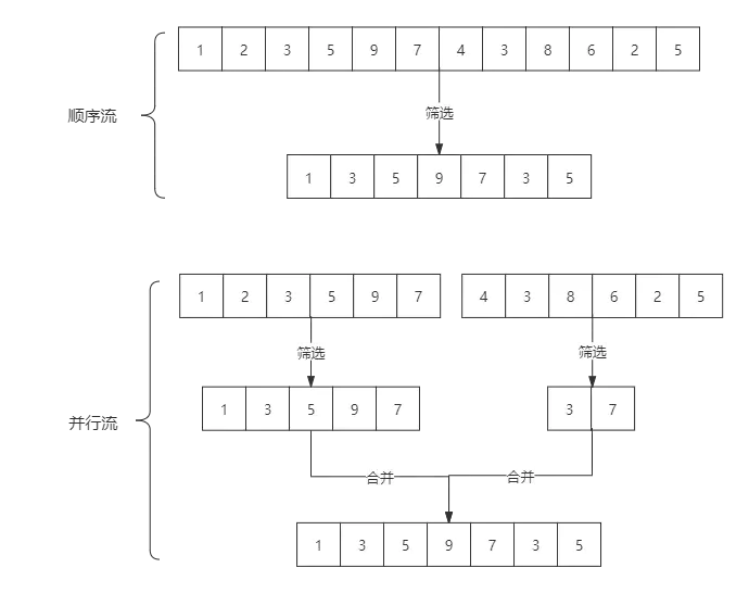 0.8116932592396652stream和parallelStream的简单区分: stream是顺序流,由主线程按顺序对流执行操作,而parallelStream是并行流,内部以多线程并行执行的方式对流进行操作,但前提是流中的数据处理没有顺序要求。例如筛选集合中的奇数,两者的处理不同之处: